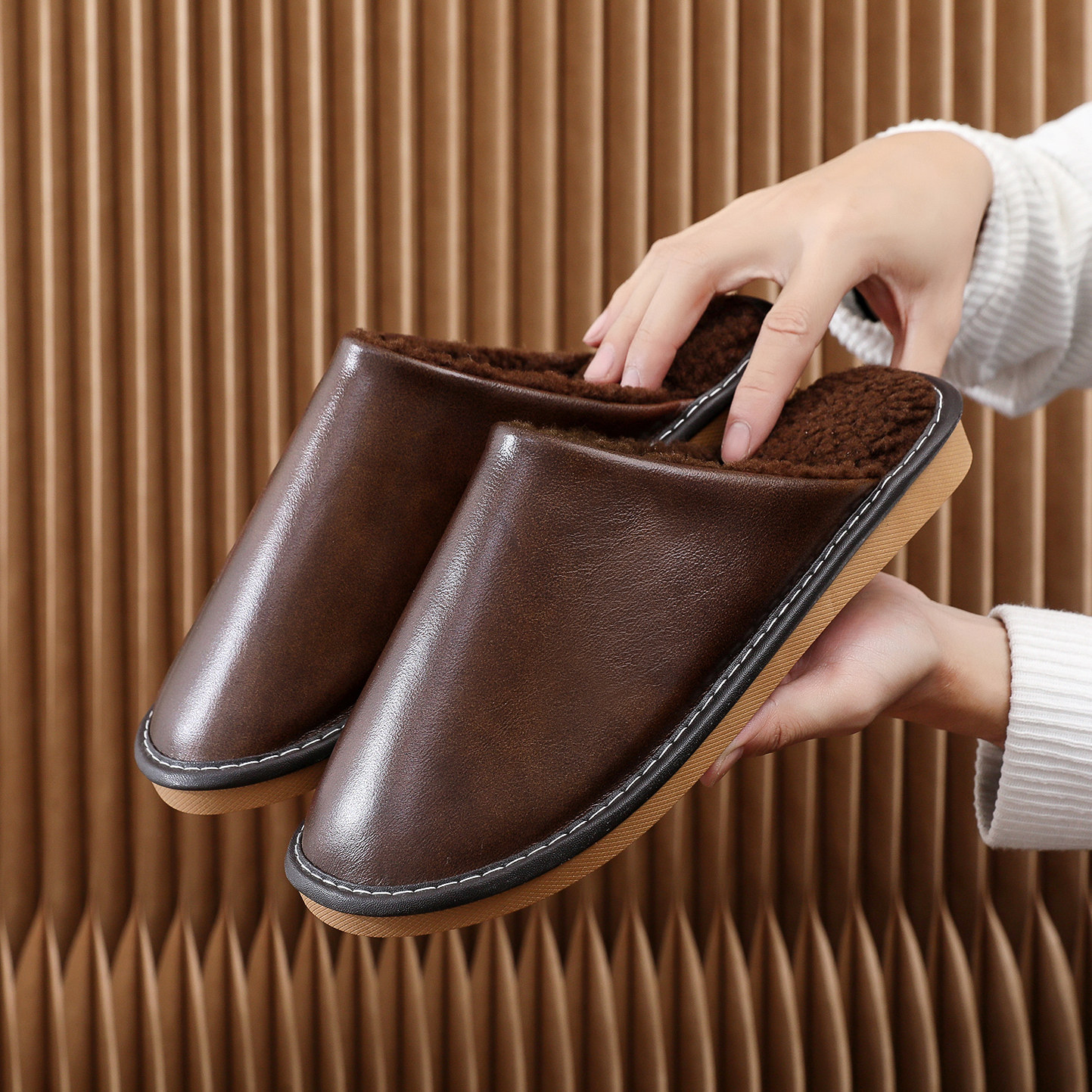 真皮包头老人棉拖鞋简约男款居家室内防滑软底保暖懒人鞋款冬季女