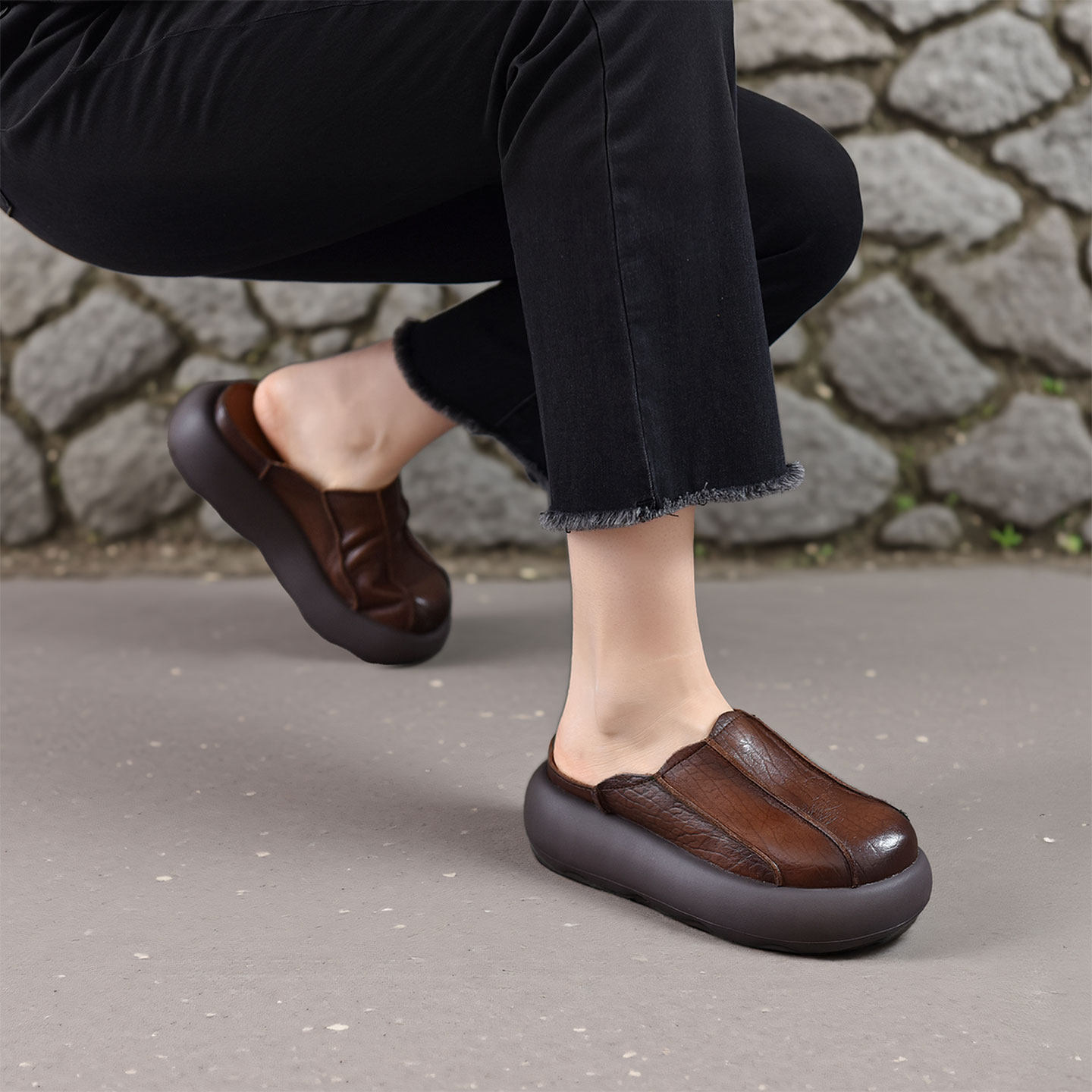 四起哥2026夏季复古风头层牛皮厚底半拖鞋女真皮包头松糕鞋休闲鞋