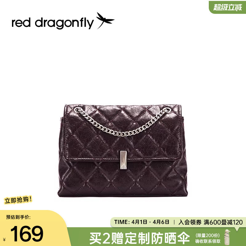 红蜻蜓复古斜挎包链条包棕色油蜡皮包包女式小香风菱格单肩小方包