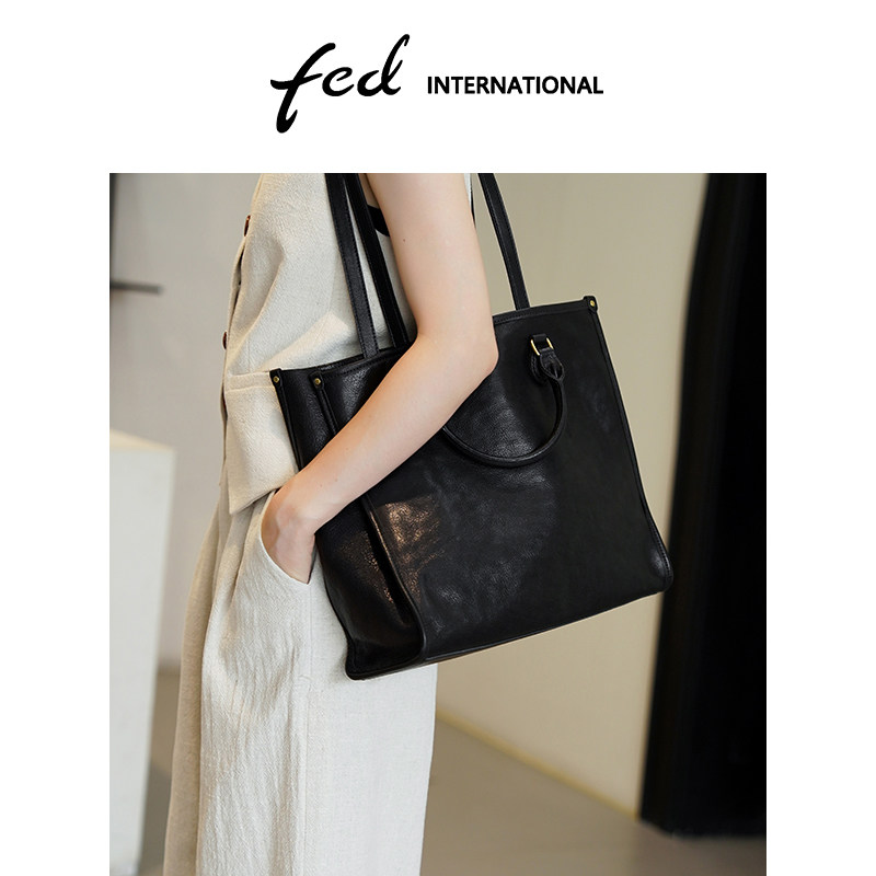 fed头层牛皮托特包女通勤大容量手提包单肩包黑色真皮包包BFA8969