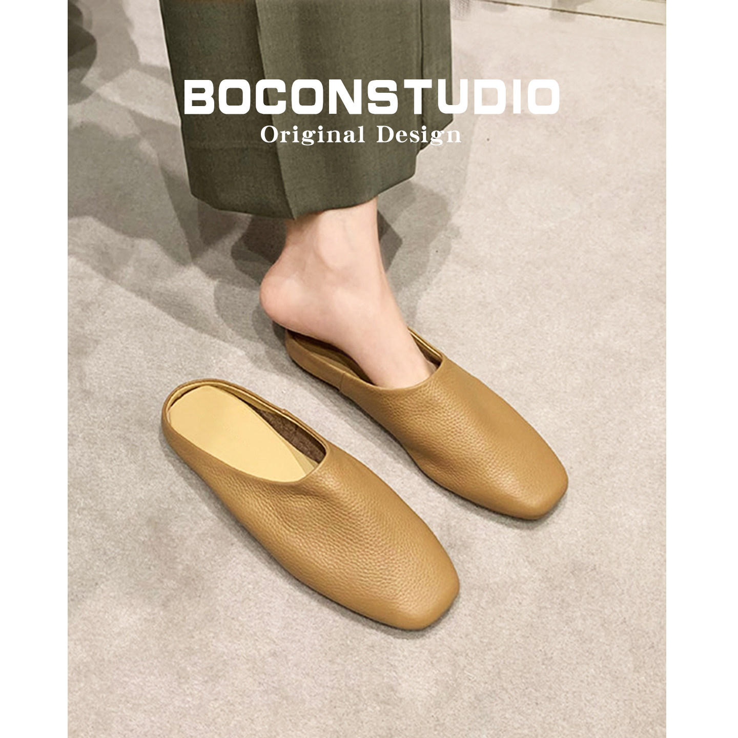 真皮包头半拖鞋女外穿2026新款春季百搭小方头一脚蹬平底穆勒鞋女