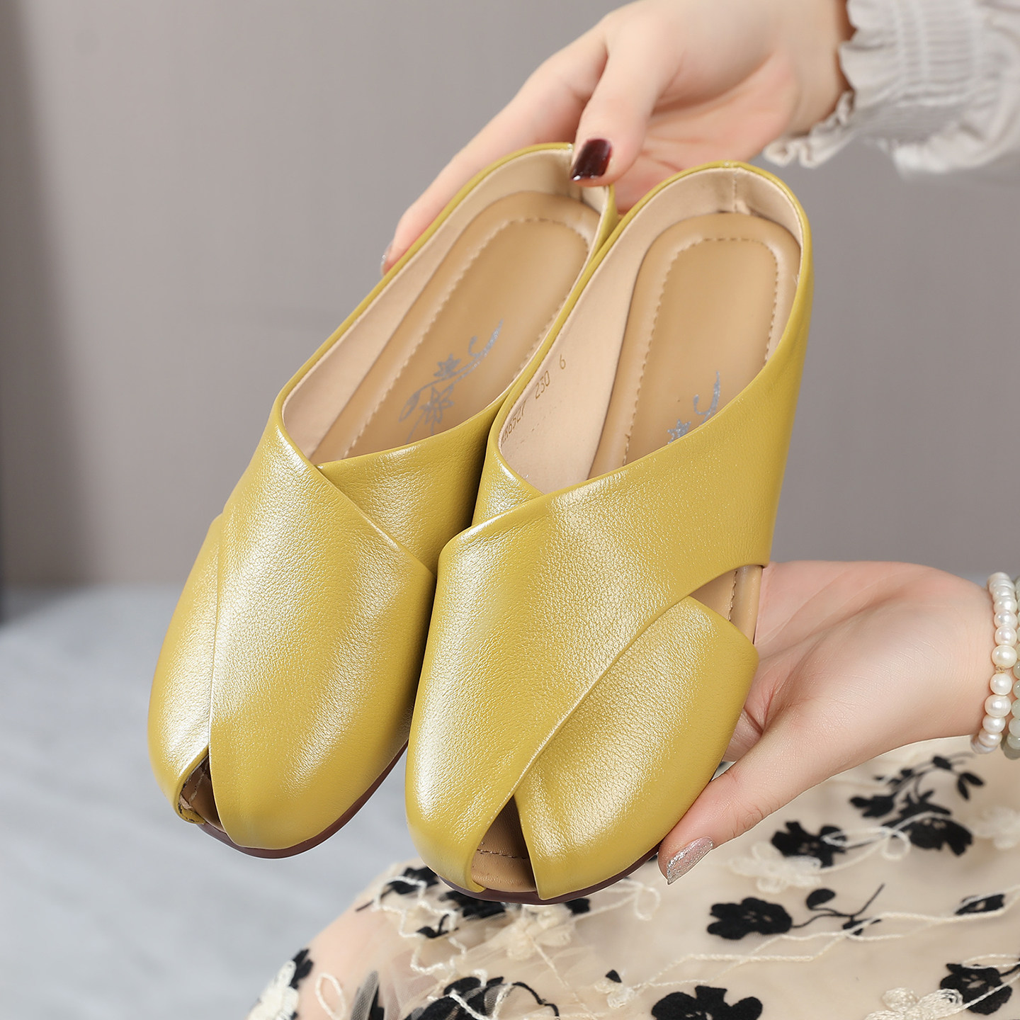 法式真皮包头半拖鞋女外穿2026新款春夏一脚蹬软皮平底穆勒鞋女