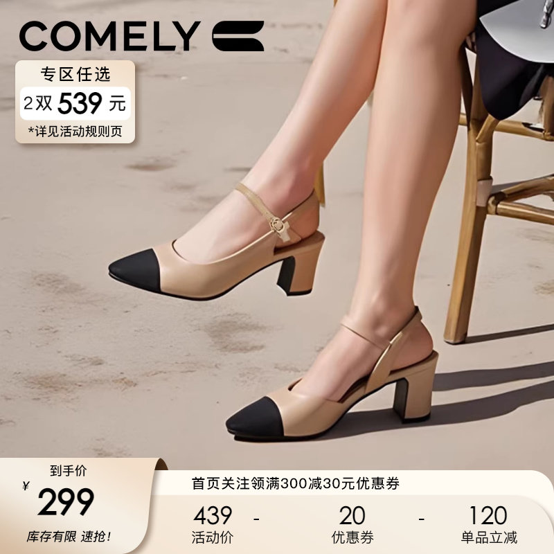 康莉真皮包头凉鞋女2025年夏季新款法式小香风粗跟一字带高跟鞋子