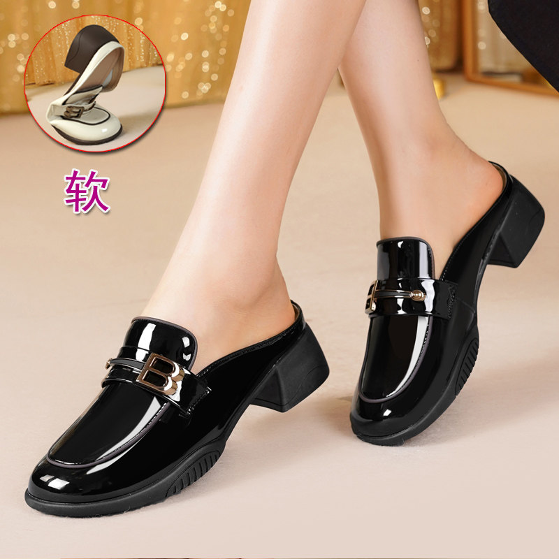 真皮包头半拖鞋女夏外穿2024新款春季中跟单鞋漆皮一脚蹬半托女鞋