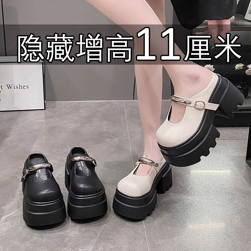 真皮包头半拖鞋女11cm2025新款小个子厚底增高休闲玛丽珍小皮鞋软