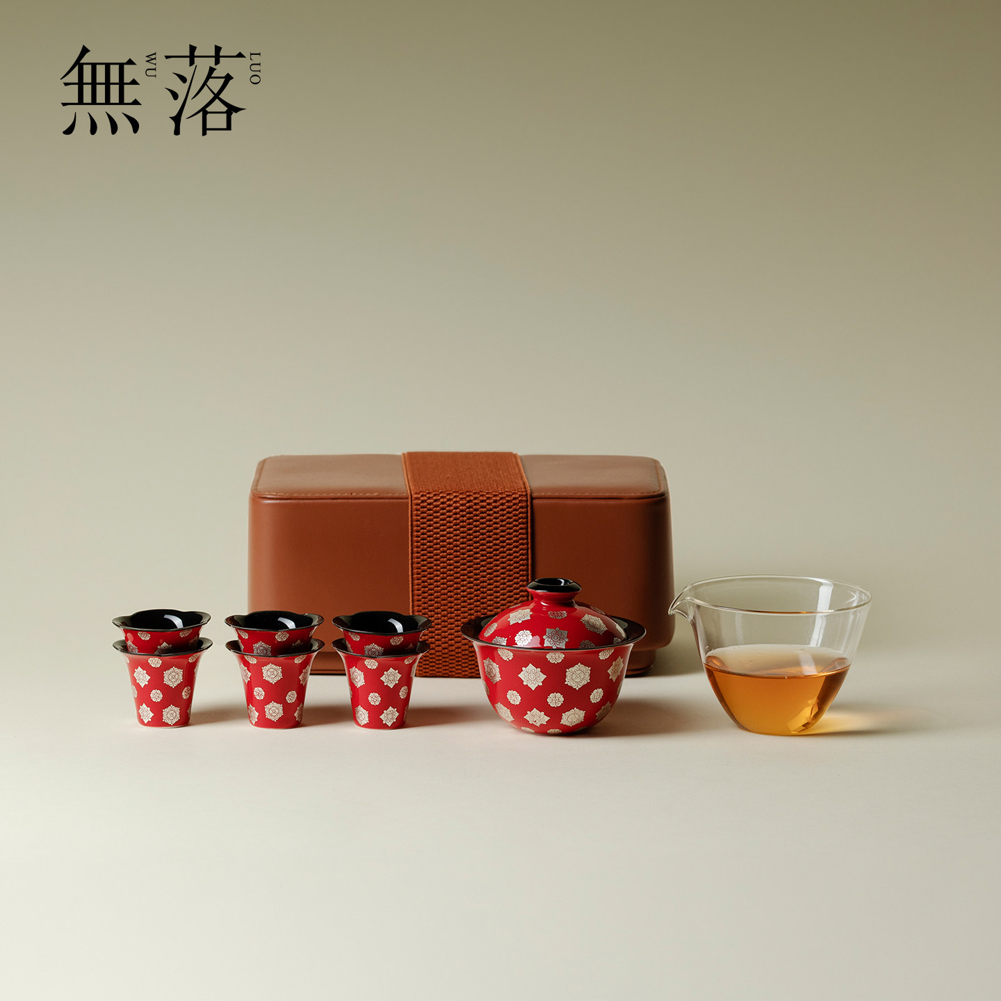 无落 整套故宫红宝相花纹银彩盖碗旅行茶具便携皮包收纳茶具套组
