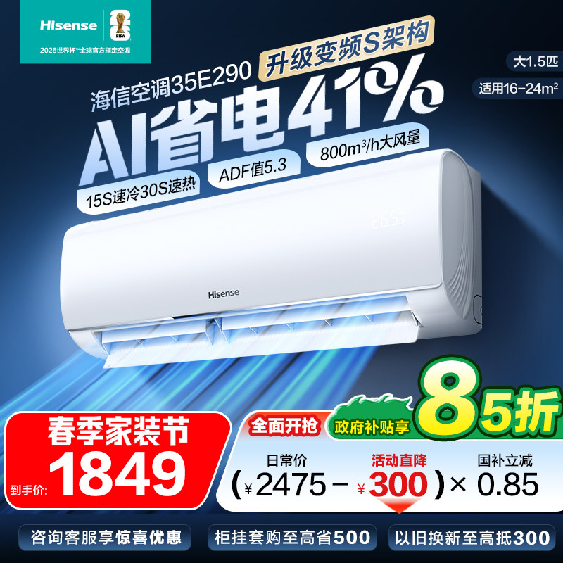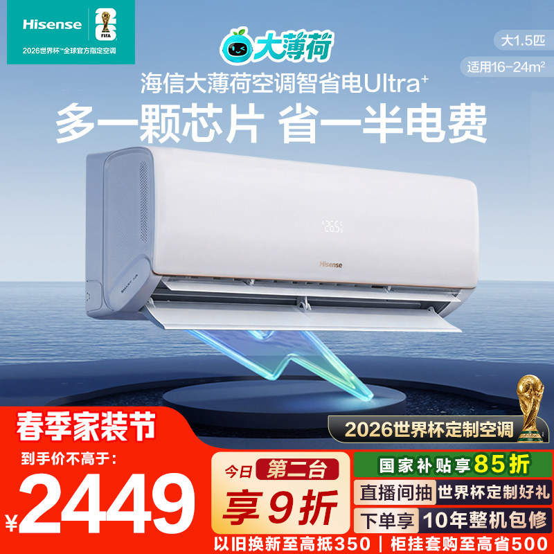 世界杯定制空调海信大薄荷智省电Ultra+大1.5匹家用挂机一级能效