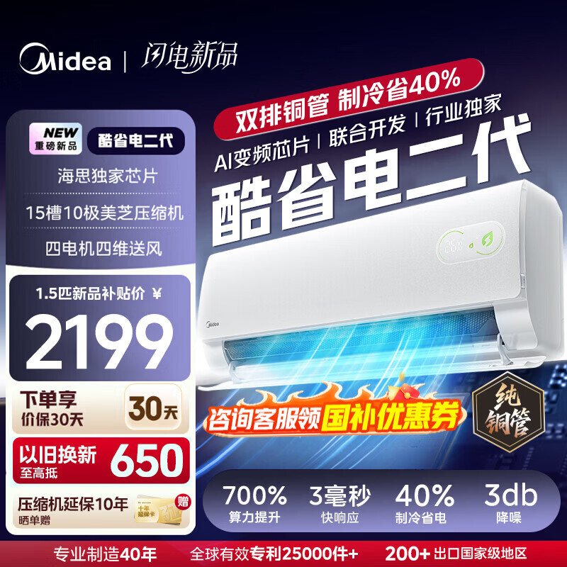 美的(Midea)空调大1.5匹挂机酷省电二代Pro新一级能效变频节能冷暖两用壁挂式卧室空调防直吹低噪WiFi智控补贴 酷省电二代 大1.5匹 海思AI变频芯片 冷热都省电