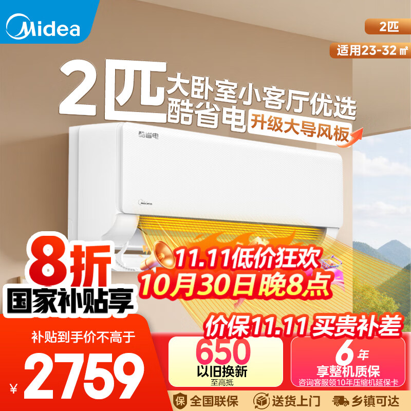 美的(Midea)空调2匹挂机 酷省电 新一级能效 卧室壁挂家用独立除湿节能省电智能家电以旧换新 2匹 一级能效 【两匹挂机】省电28%