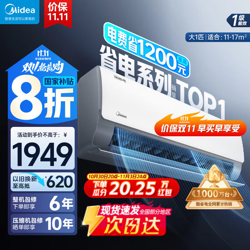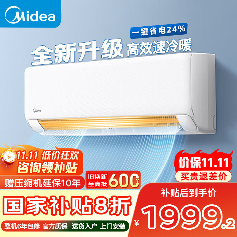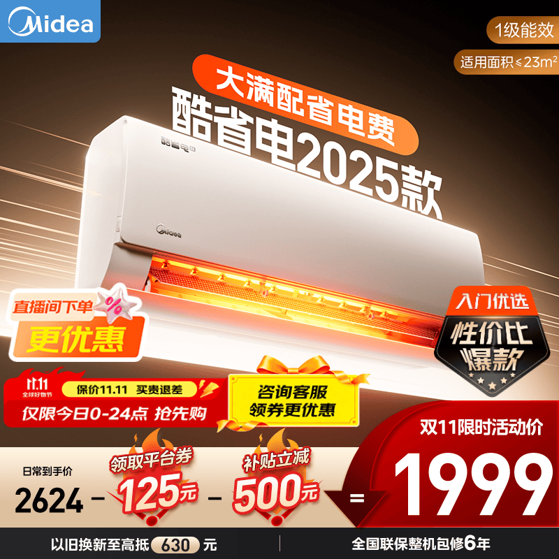 美的空调挂机 酷省电 大1.5匹1匹 新一级能效 变频冷暖 卧室壁挂式 以旧换新 家电国家补贴20% 大1.5匹 一级能效 酷省电Pro | 咨询客服更优惠
