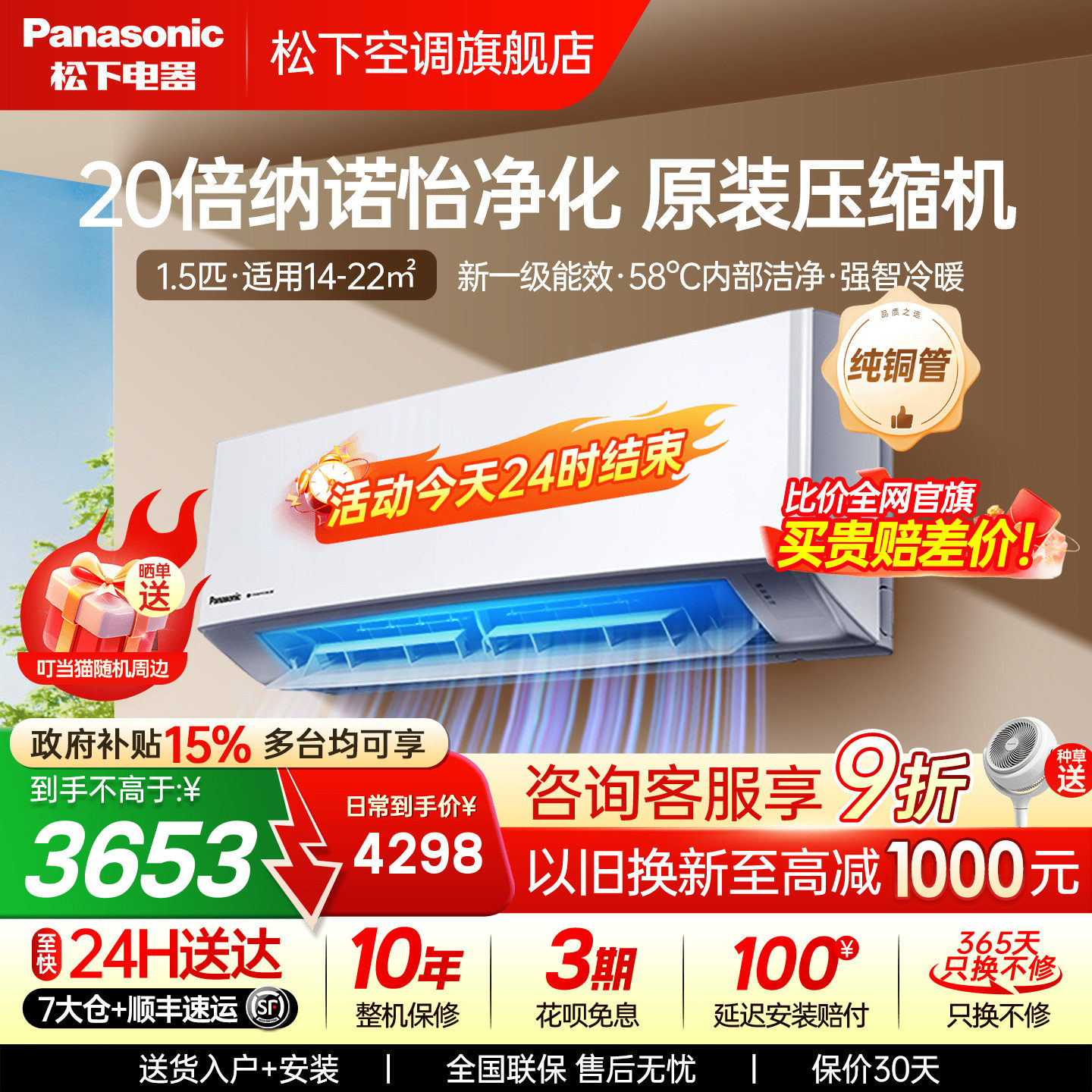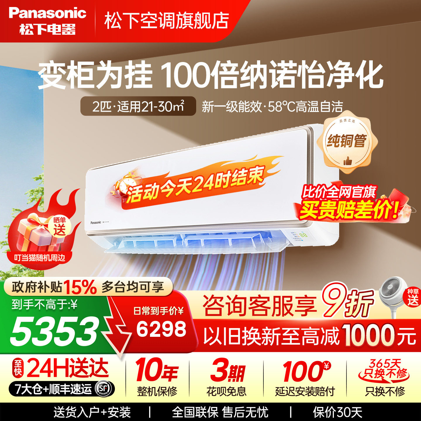国补15%!松下2匹空调100倍纳诺怡一级能效自清洁挂机CA50K410N