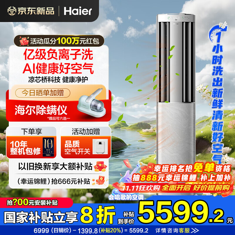 海尔空调净省电Plus 3匹强劲冷暖新一级能效节能变频家用立式柜机独立除湿以旧换新升级大风口离子除菌 3匹 一级能效 净省电神机+离子除菌+省电大魔王