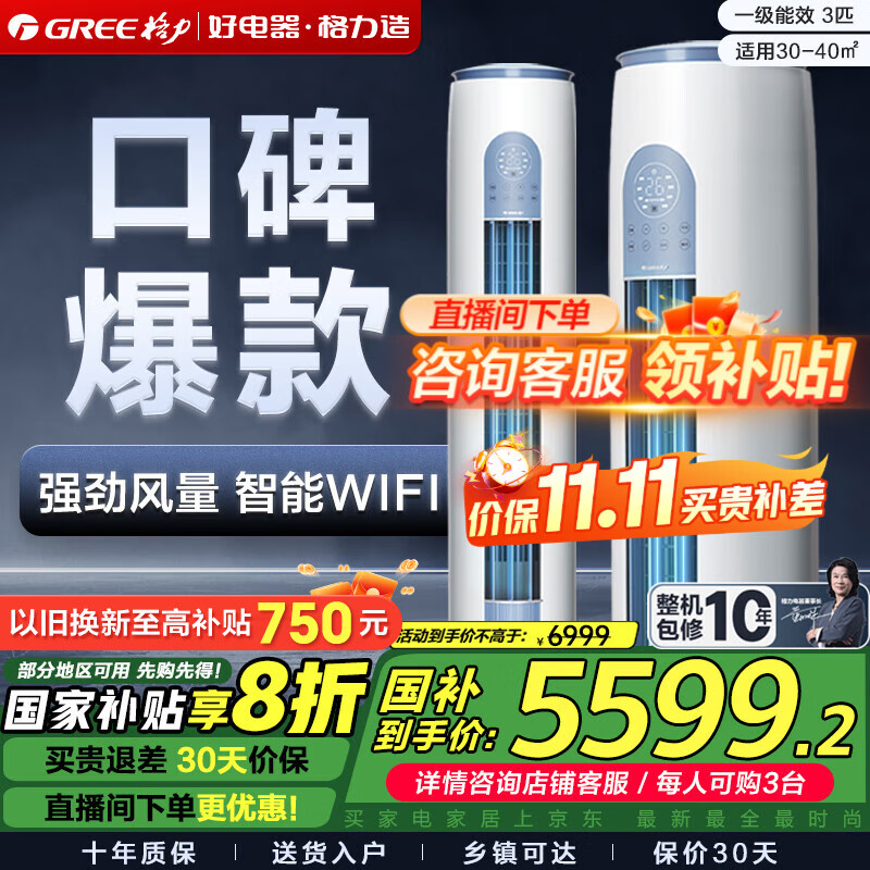 格力(GREE)空调云逸Ⅱ3匹一级能效变频冷暖自清洁智能WiFi大风量家用圆柱立式柜机【国家补贴20%】 3匹 一级能效