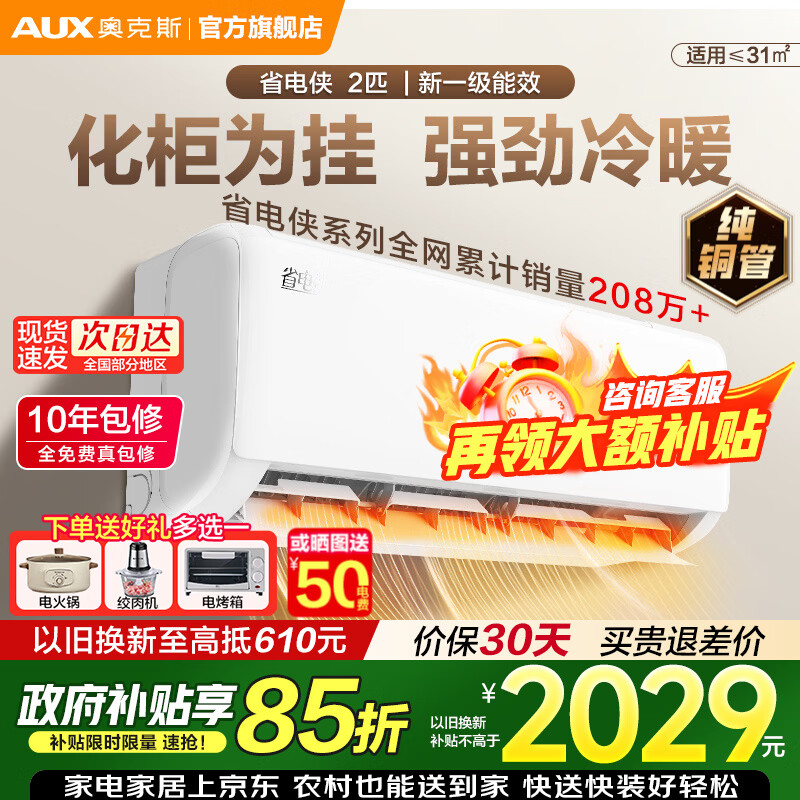 奥克斯(AUX)空调2匹大挂机新一级能效家电补贴15%变频冷暖壁挂式防直吹家用大卧室客厅商居两用自清洁以旧换新 2匹 一级能效【省电侠】高性价比 澎湃大风量