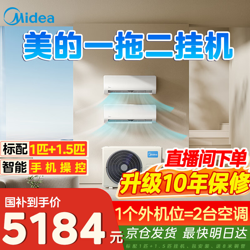 美的空调一拖二挂机 子母空调一拖二 家用挂机一拖二 公寓精装房空调老房改造省外机位包安装 大2匹 一拖二挂机空调(京仓配送)