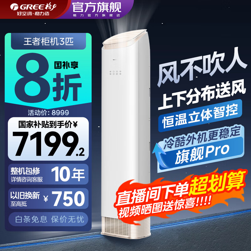 格力(GREE)空调王者京致2/3匹分布送风新一级能效变频防直吹衡温客厅立式智能柜机家用官方旗舰店国家补贴20% 3匹 一级能效 王者 上下出风 健康防直吹 高端系列柜机