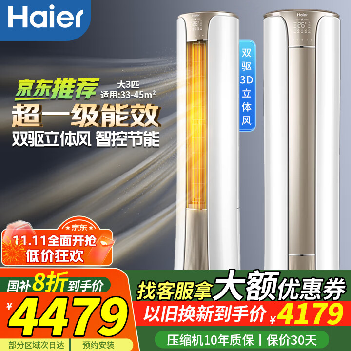 海尔空调柜机3匹速享风 新一级能效圆柱柜式变频节能大风量家用客厅防直吹 WiFi智控 3匹 一级能效 速享风奢华版
