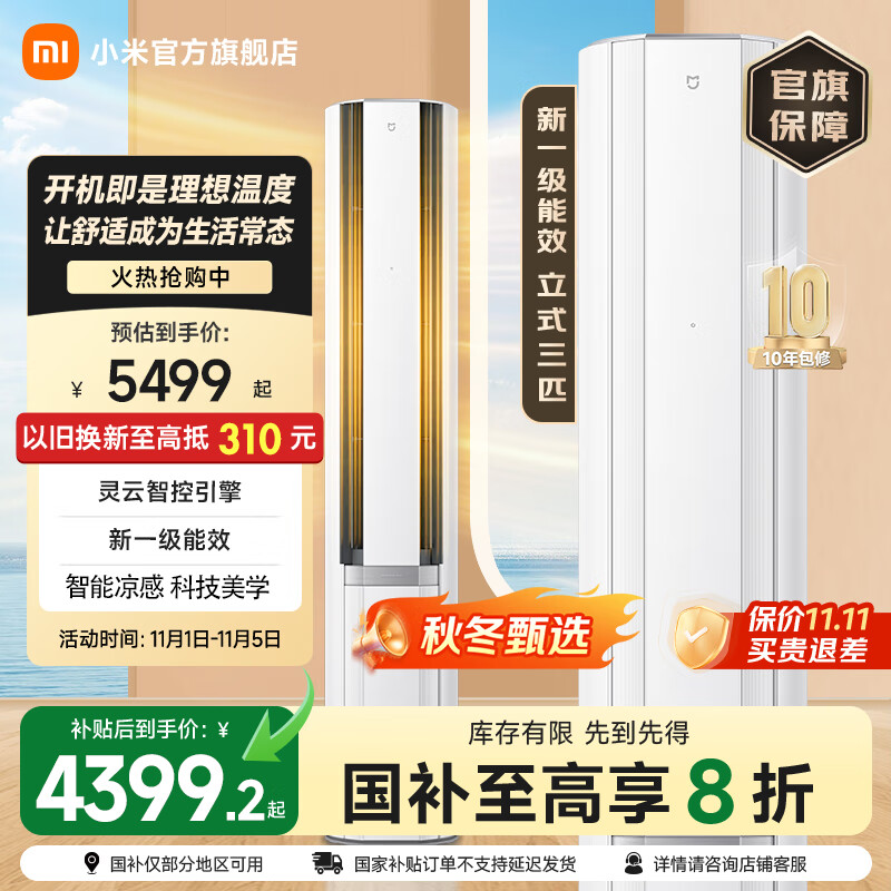 小米(MI)米家空调 3匹 立式空调 客厅空调柜机 自然风一级能效 变频冷暖 72LW-NA11/M2A1冰晶白 3匹 一级能效