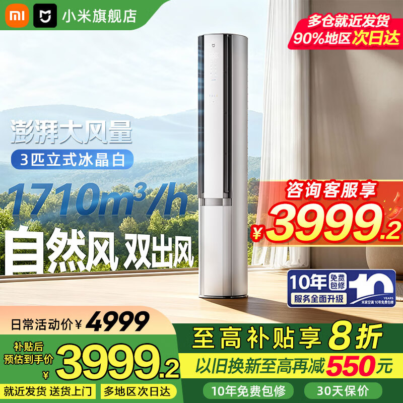 小米(MI)【国家补贴20%】空调米家 3匹 自然风冰晶白 双出风 自然风感 新一级能效 柜机空调72LW-NA11/M2A1 3匹 一级能效 自然风双出风冰晶白