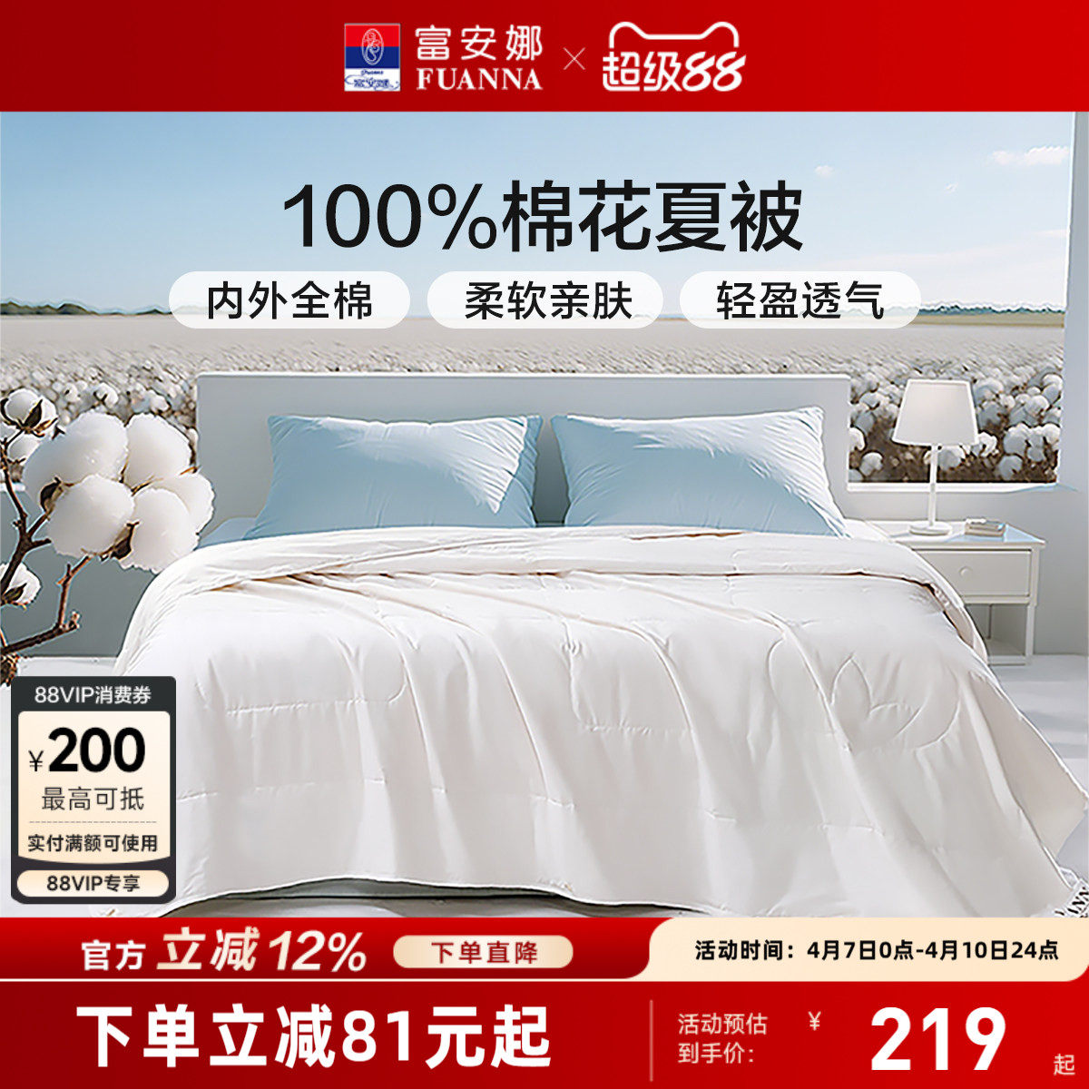 富安娜家纺100%棉花被A类全棉夏被纯棉被子夏季空调被芯夏凉被子