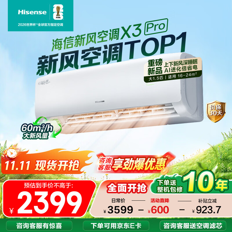 海信(Hisense)新风空调 X3Pro 大1.5匹 增氧新风 AI省电 新一级能效国家补贴20% 深睡眠挂机KFR-35GW/X300Pro-X1 大1.5匹 一级能效 【咨询客服享大额优惠】