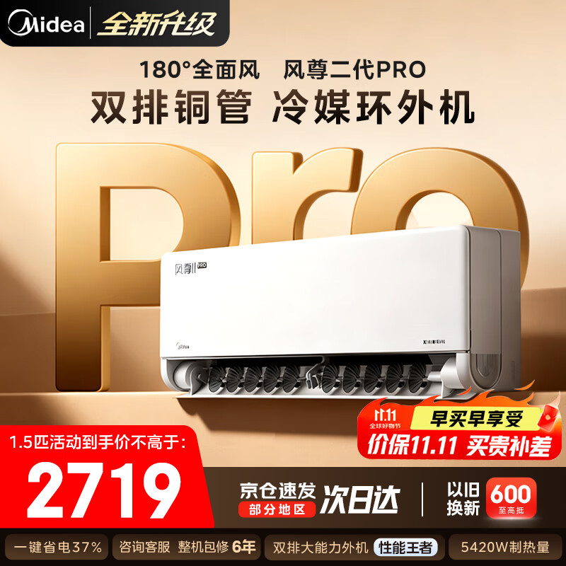 美的(Midea)空调挂机 1.5匹/2匹 新款风尊二代/升级PRO新一级能效变频冷暖 省电变频卧室空调 家电国家补贴20% 大1.5匹 一级能效 全新升级 风尊二代PRO