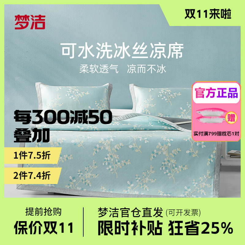 梦洁家纺冰丝席凉席可水洗两三件套床席夏季学生宿舍空调席子花意