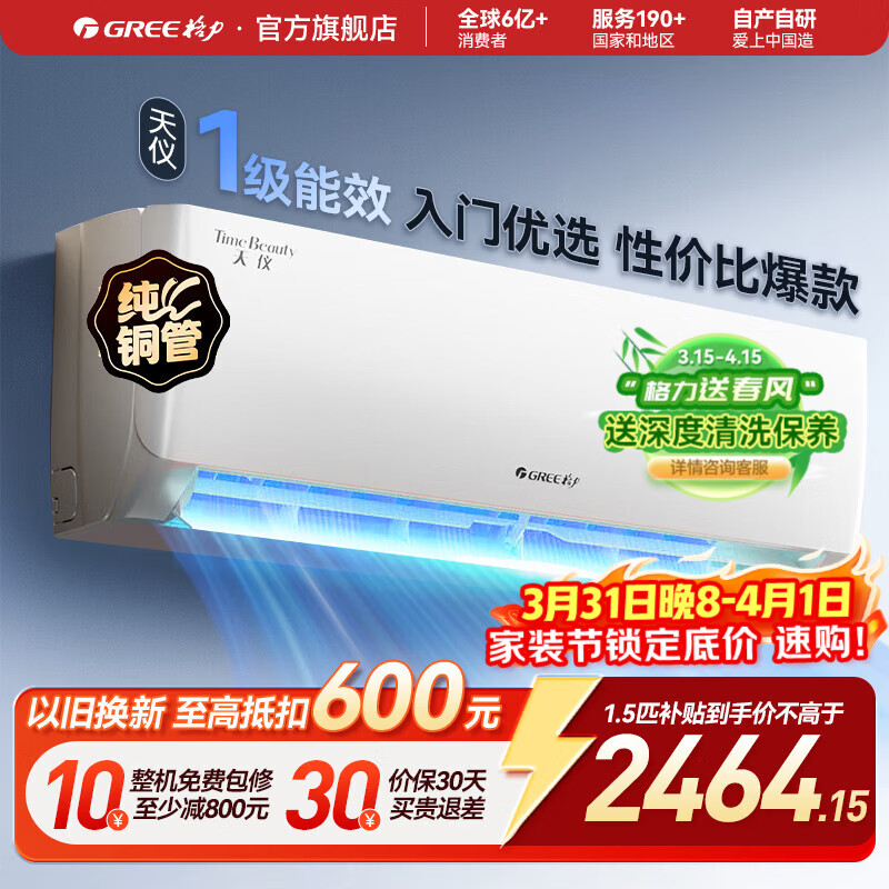 格力(GREE)空调挂机天仪PRO1.5匹/1p 新一级能效 变频冷暖两用 净菌自清洁壁挂式 家电以旧换新 国家补贴 天仪 一级能效 1.5匹 适用面积约16-20㎡