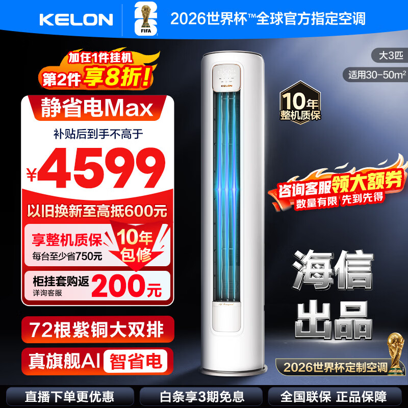 科龙(KELON)空调 海信出品 静省电MAX 询单减200 大3匹柜机 客厅立式新一级变频家用冷暖轻音好眠AI省电 大3匹 一级能效 【咨询享国补价】
