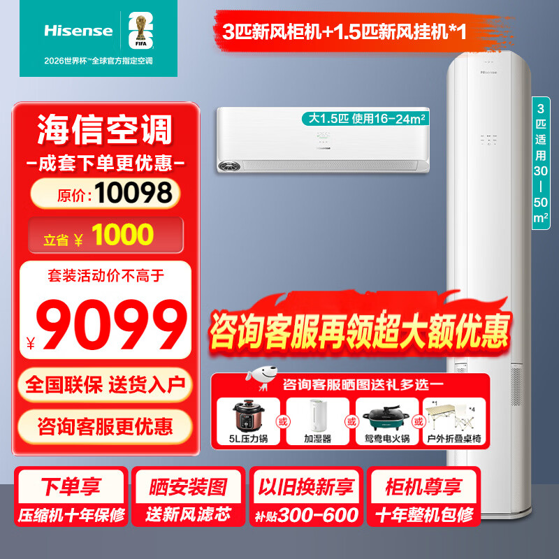 海信(Hisense)新风空调套装四室两室三室一厅 X5系列 大3匹客厅立式柜机+大1.5匹挂机AI洁净新风 语音智控 【一室一厅】挂机35x5*1+柜机72x5*1