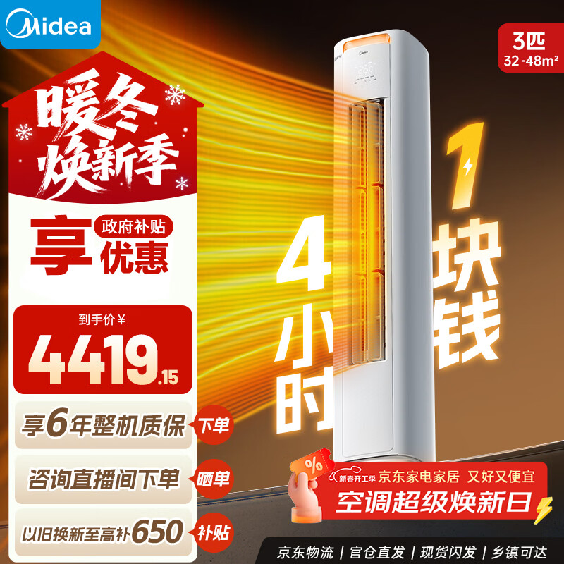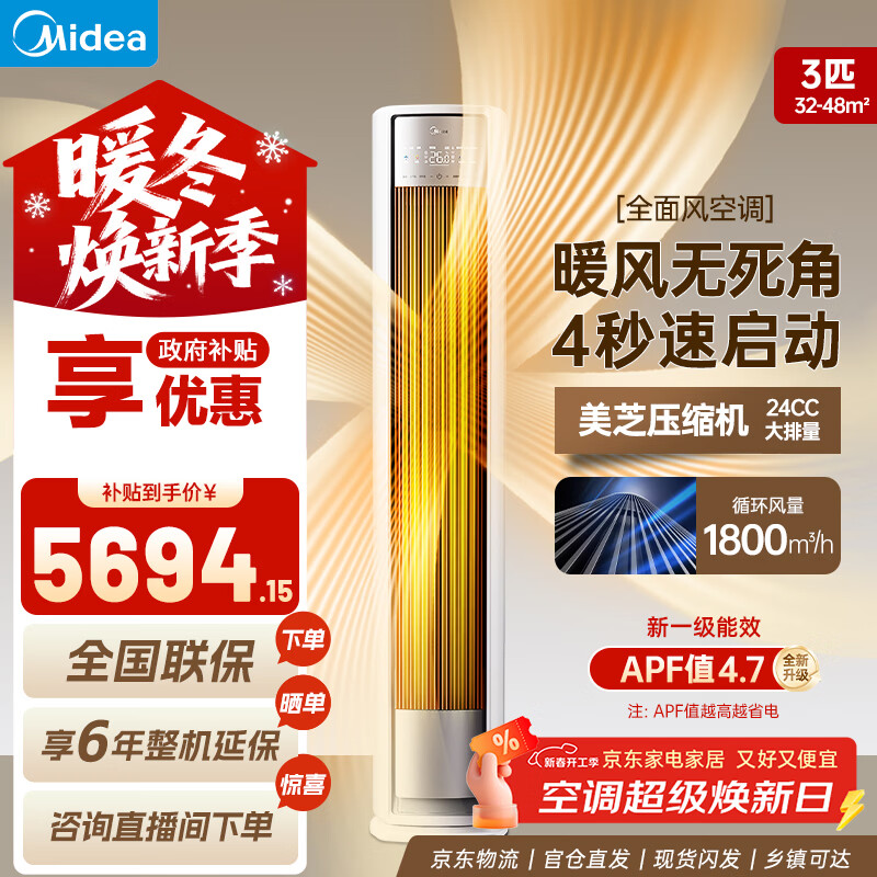 美的空调立式柜机全面风 风尊二代 3匹 新一级能效变频冷暖 客厅智能 电量查询 以旧换新 全面风 新一级能效柜机 大3匹 25年重磅新款