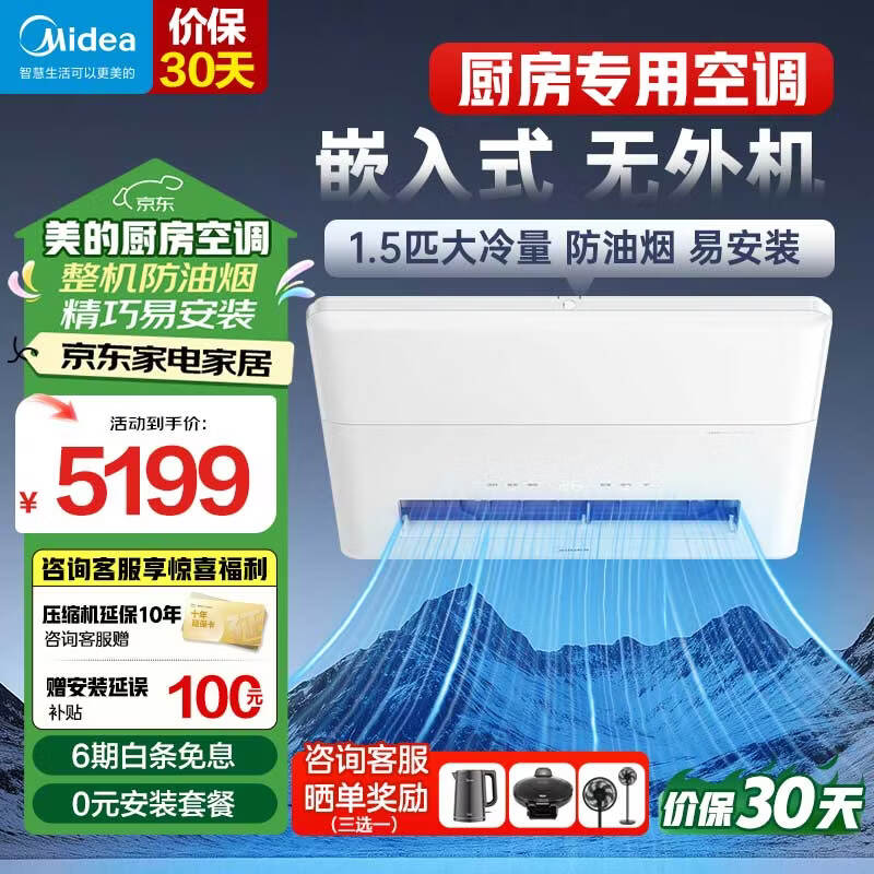 美的(Midea)厨房空调 小凉方 吸顶式1.5匹 新等级能效 变频节能省电 防油烟大冷量家用厨房专用空调 厨房空调 大1.5匹 YT100【无外机新品】