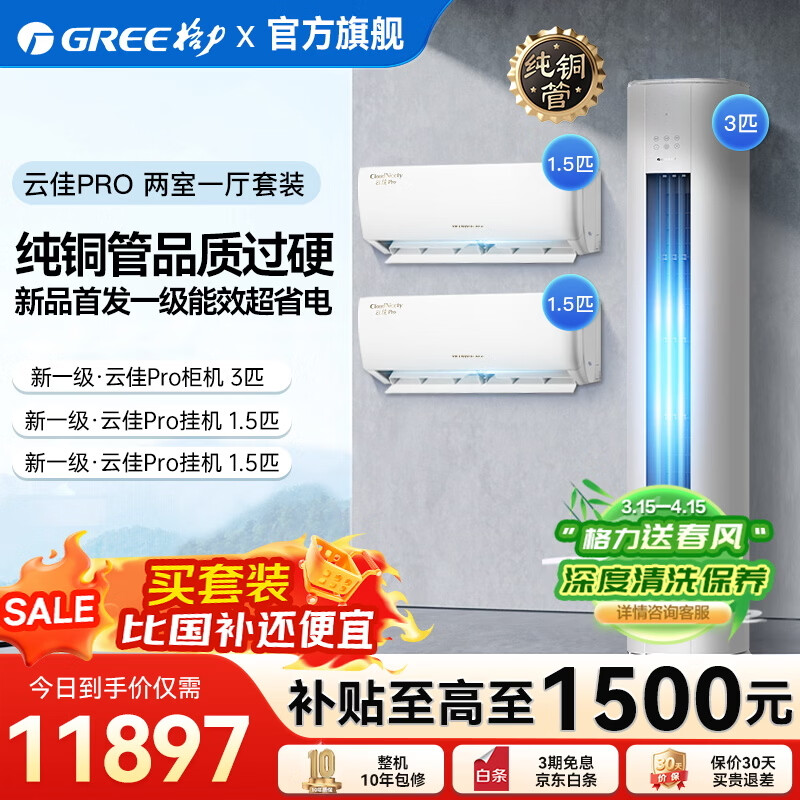 格力国家补贴空调套装新一级能效高温自清洁家用节能省电变频组合挂机柜机云锦pro云佳PRO套装以旧换新 【云佳PRO新上市】两室一厅1.5匹*2+3匹*1