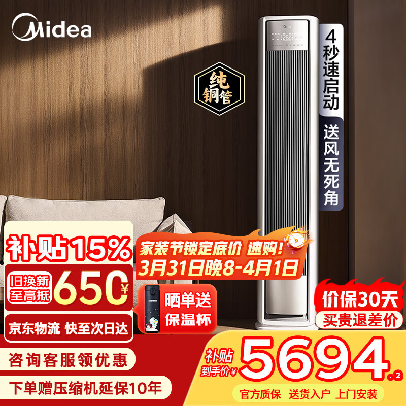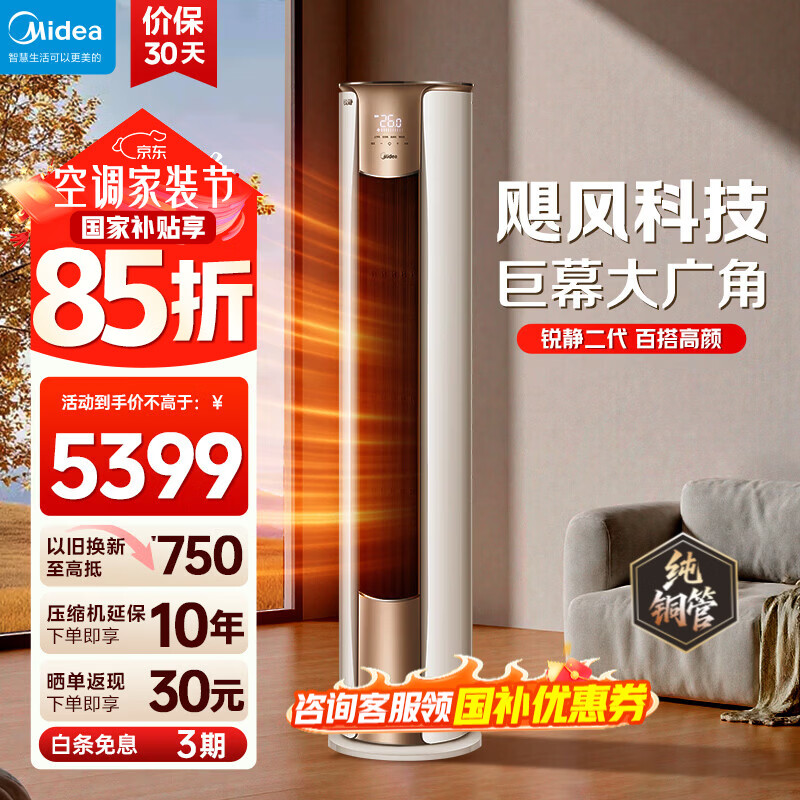 美的(Midea)3匹空调85折国家补贴15%锐静二代新一级能效变频冷暖大风口家用客厅空调立式柜机美的家电国补政府 大3匹 一级能效锐静二代(大风口)