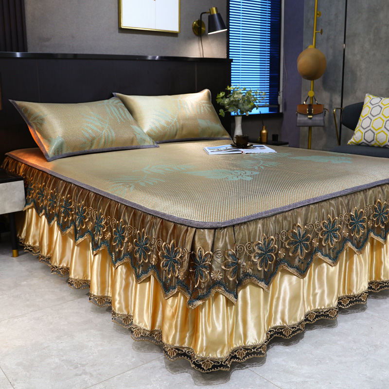 夏季凉席三件套欧式冰藤席床裙款可拆卸蕾丝边空调软席可折叠床罩