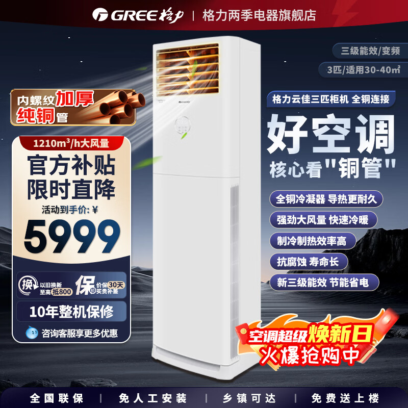 格力(GREE)【旗舰】企业采购纯铜管空调云佳/凉之夏/冷静宝 柜机3匹三级能效强效制冷暖变频立式柜机以旧换新 3匹 云佳双排铜管【性价比优选】