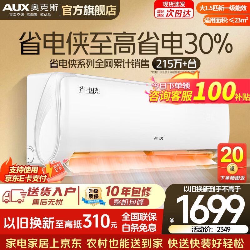 奥克斯(AUX)空调1.5匹挂机 自清洁 变频速冷暖 低噪节能 以旧换新 壁挂式家用节能 省电侠 大1.5匹 一级能效省电侠(省电30%)