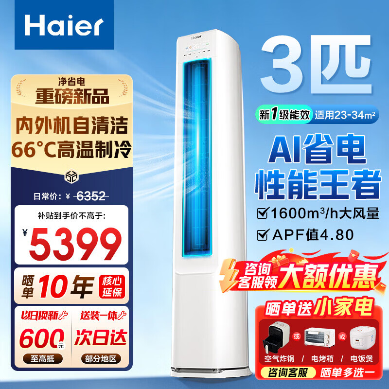 海尔(Haier)空调净省电PLUS 3匹立式柜机新一级能效快速冷暖变频自清洁 独立除湿家用客厅 净省电 3匹 AI省电科技+新品推荐