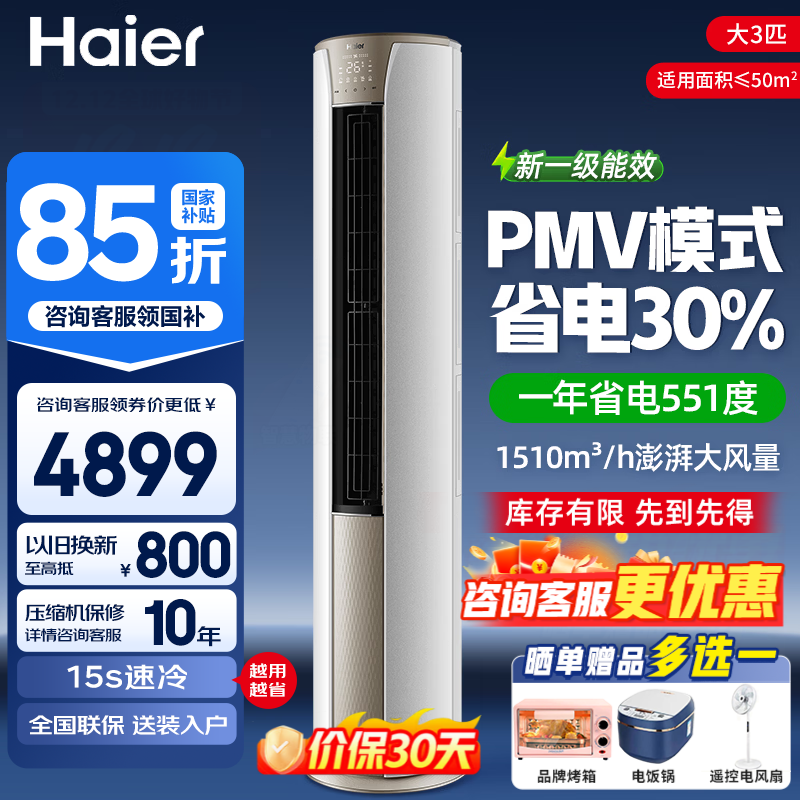 海尔(Haier)空调大3匹柜机 净省电小红花新一级能效全直流变频冷暖大风口家用自清洁WiFi智控客厅圆柱立式空调 静悦 大3匹 一级能效 一键PMV 省电30%