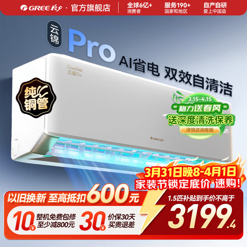 格力(GREE)空调云锦Pro/云锦三代挂机超一级新能效Ai节能省电变频冷暖自清洁壁挂式卧室家用 云锦Pro新款上市 1.5匹 AI智能省电 风量升级