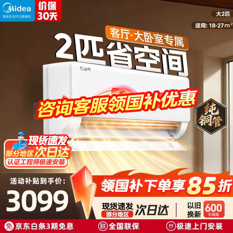美的(Midea)2匹空调 大3匹酷省电二代 新一级能效 变频冷暖 自清洁 壁挂式空调挂机除湿 智能家电 酷省电 一级能效 2匹