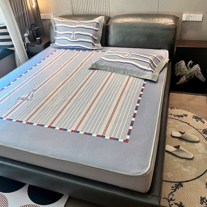 简约条纹夏季撞色凉席床笠三件套 冰丝凉感家用折叠软席子空调席