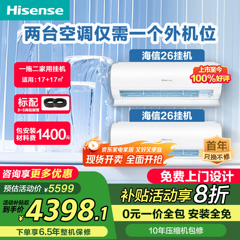 海信(Hisense)一拖二空调包安装【咨询享低价】全新升级大2匹/3匹智控直流变频冷暖复式loft公寓空调一拖二挂机 大2匹 一级能效 带8米铜管大1匹+大1匹咨询享低价