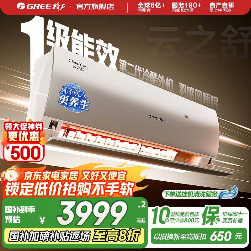 格力(GREE)云之舒 新一级能效 变频冷暖自清洁智能WiFi 壁挂式卧室空调挂机 家电以旧换新 风不吹人 1.5匹 一级能效 云之舒挂机