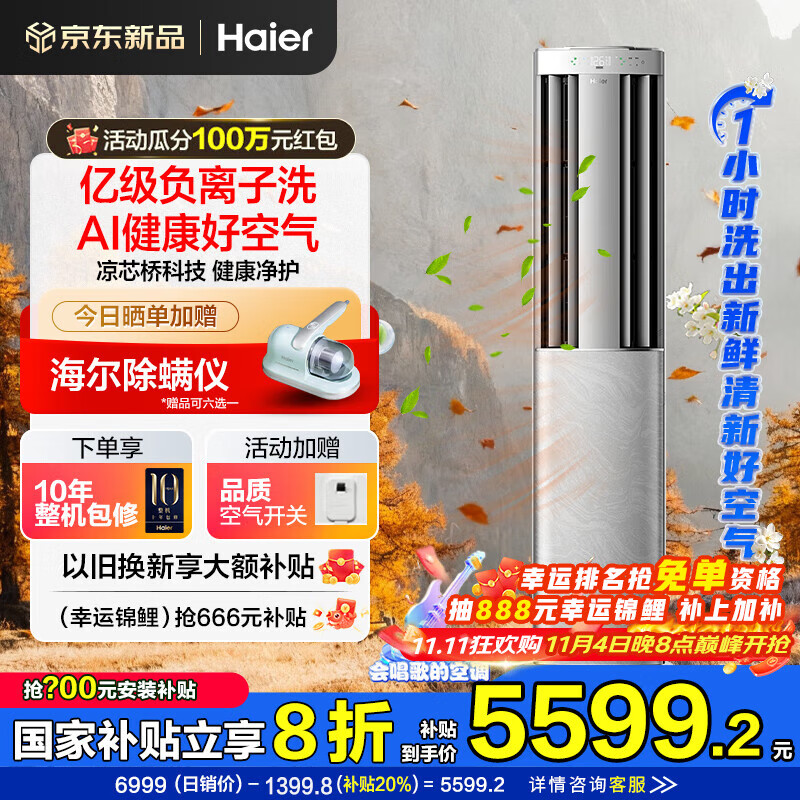海尔空调洗空气Pro 3匹新一级变频客厅除菌立式柜机 声源定位送风恒温除湿 智慧除湿 高能负离子除醛 3匹 一级能效 洗空气+除甲醛+除7类空气污染物