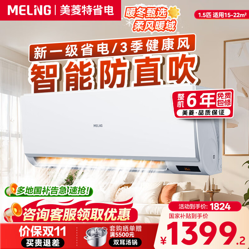 美菱特省电空调 家电国家补贴20% 大1.5匹 新一级能效 以旧换新 变频冷暖卧室空调挂机 节能静音防直吹 大1.5匹 一级能效 舒适风【6年包修】