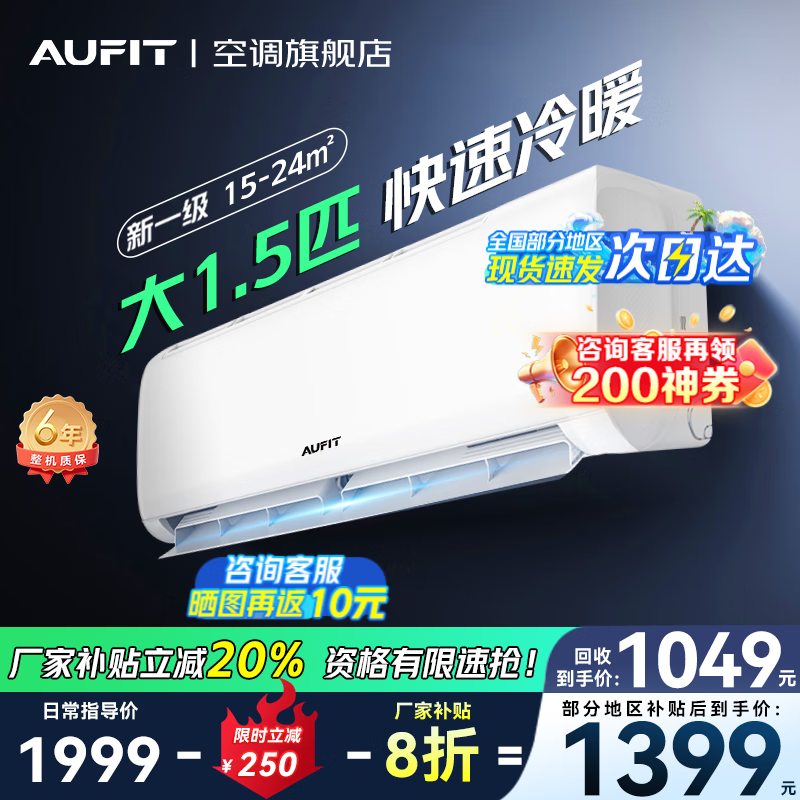 AUFIT空调奥克斯(AUX)出品大1.5匹挂机新一级能效变频冷暖家用卧室壁挂式防直吹除菌自清洁以旧换新 大1.5匹 一级能效 省电防直吹自清洁【基础款】