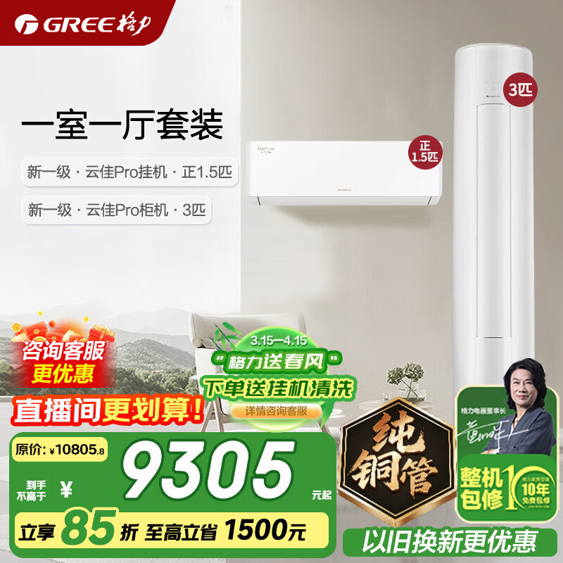 格力空调套装 云佳pro 新一级能效 变频冷暖 纯铜管 节能省电 客厅立式柜机柜挂组合套装 家电国家补贴 【一室一厅】1.5匹云佳Pro+3匹云佳Pro