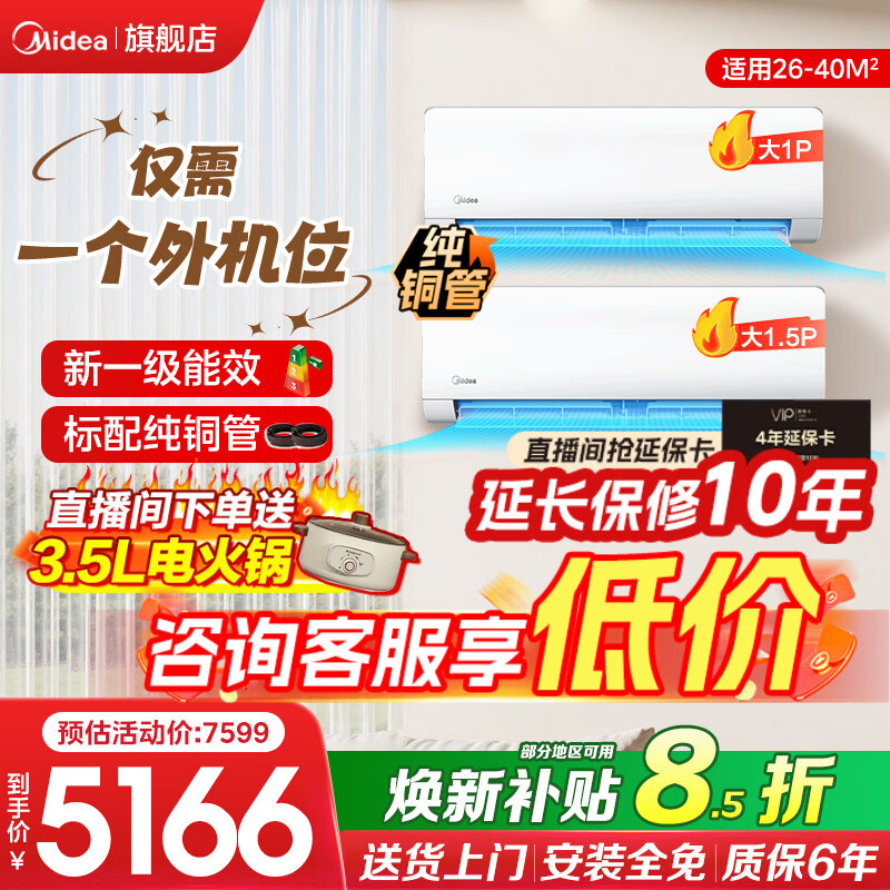 美的(Midea)中央空调一拖二挂机1.5匹+1匹2新一级能效变频省电卧室客厅公寓家用壁挂两室一室一厅套装以旧换新 一拖二挂机 1.5匹+1匹