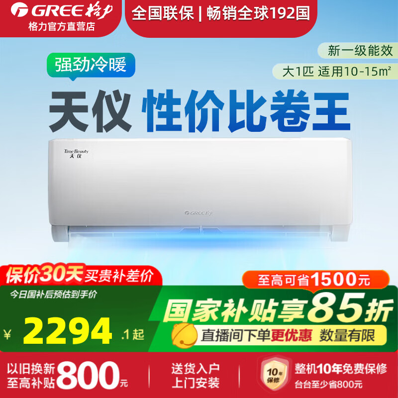格力(GREE)空调【国家补贴15%】大1匹/1.5匹/3匹 天仪新一级省电变频冷暖 56℃净菌自清洁 壁挂式卧室挂机柜 天仪 【热销爆款】新一级能效 大1匹 适用10-15㎡ 【含基础安装价格】